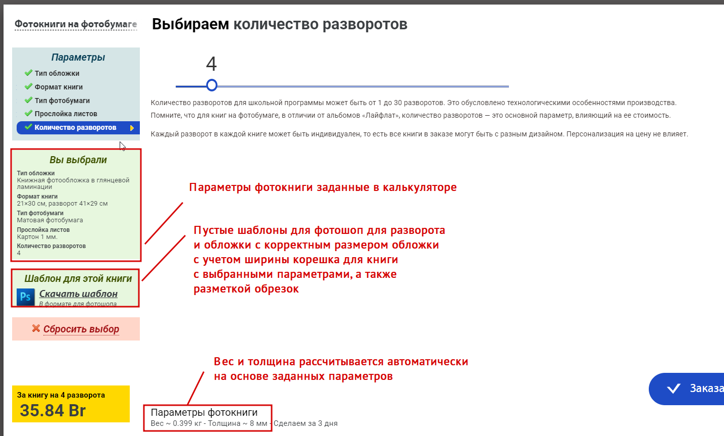 Посмотреть параметры фотокниги, а также скачать ее шаблон можно в калькуляторе:
